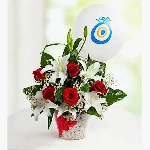 5 adet Beyaz Lilyum ve 5 adet Kırmızı Gül ile hazırlanmış Mutlu Düşler çiçek aranjmanı ve hediyesi nazar boncuğu balon, sevdiklerinizi kocaman gülümsetecek.