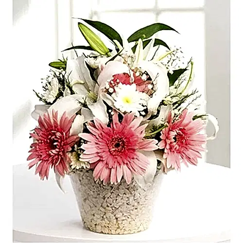 Sevdiklerinizi mutluluğa davet edin! Saflığın ve temizliğin anlatıcısı beyaz lilyumlar ve biçmeler ile neşeli pembe gerberaların mutluluk dolu kavuşmasının keyfini çıkarın.