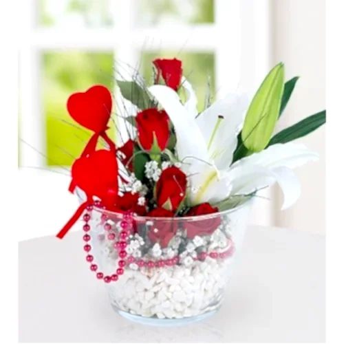 Sevginizi bu özel aranjman ile anlatmanın tam zamanı! Konik cam vazo içerisinde dekoratif taşlarla süslenmiş, 7 adet kırmızı gül, beyaz lilyum ile hazırlanmış, 2 adet kalp çubuk hediyeli Sevginin Adı çiçek aranjmanı ile en güzel anlara mutluluk katın.